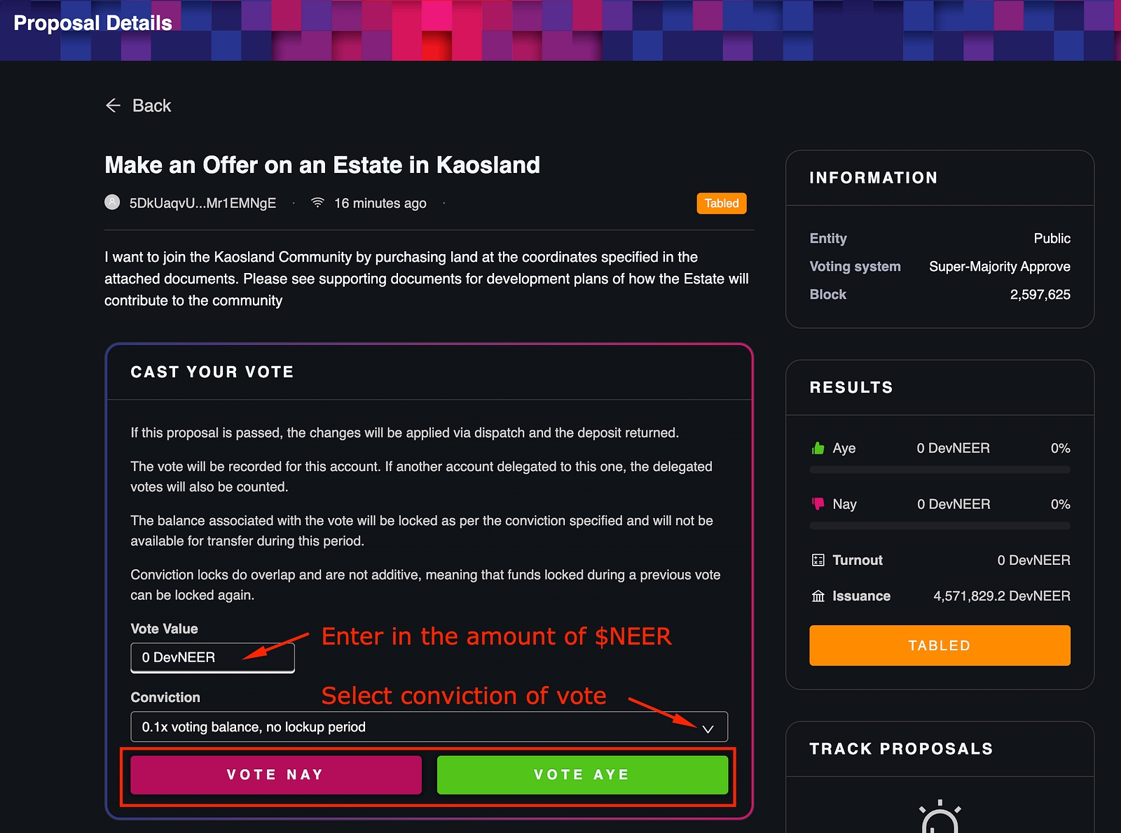For example, if you select the 2x voting balance, locked for 2x enactment option. It means that your amount of $NEER committed will be multiplied by 2 AND will be locked for 2x the duration of the enactment period. The enactment period is the time after the referendum closes that is granted to put the proposal into effect.