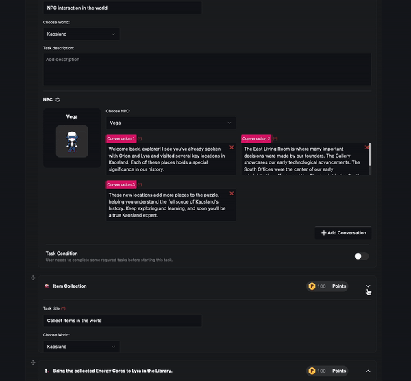The Task Conditioning feature ensures that participants complete prerequisite tasks, hold specific assets or give exclusivity and advantages to quest participants by enhancing the flow and structure of your quests.